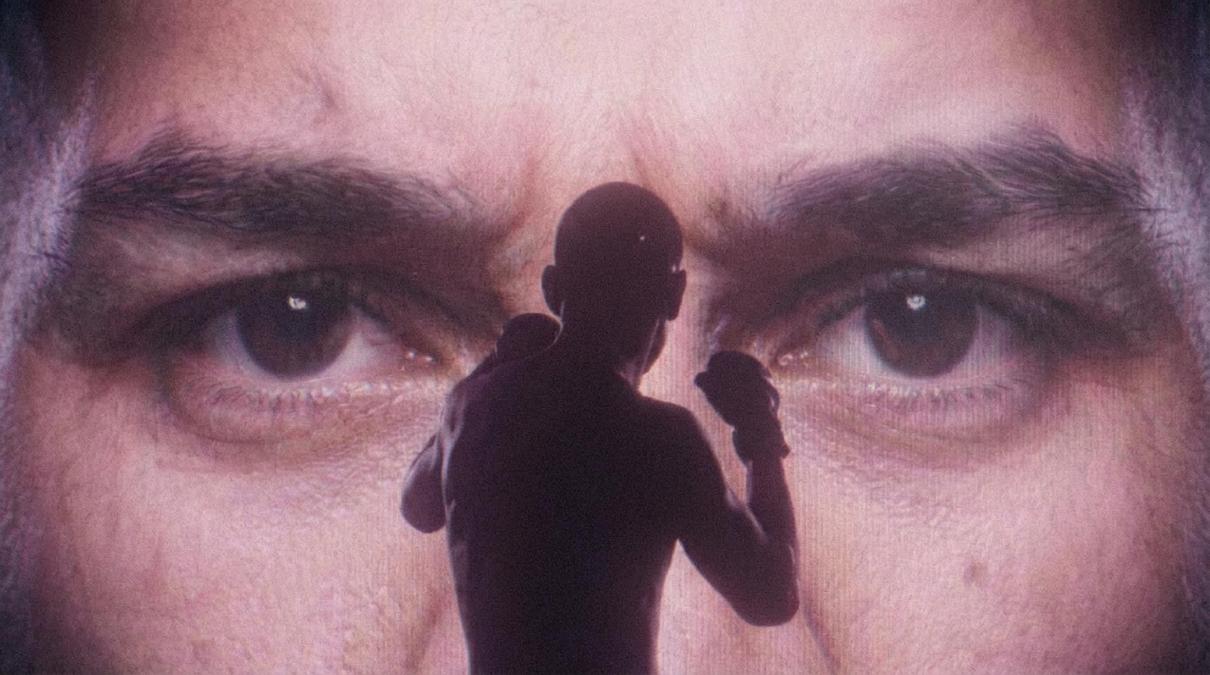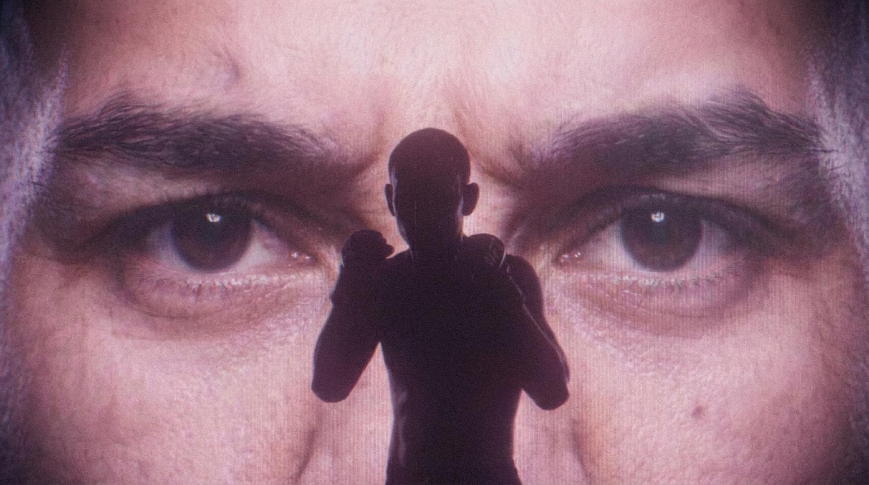 Fighter as icon. A lone silhouette stands before a monumental close-up of his own eyes — scale, focus, and implied power. Clean, typographic, prestige broadcast energy.
