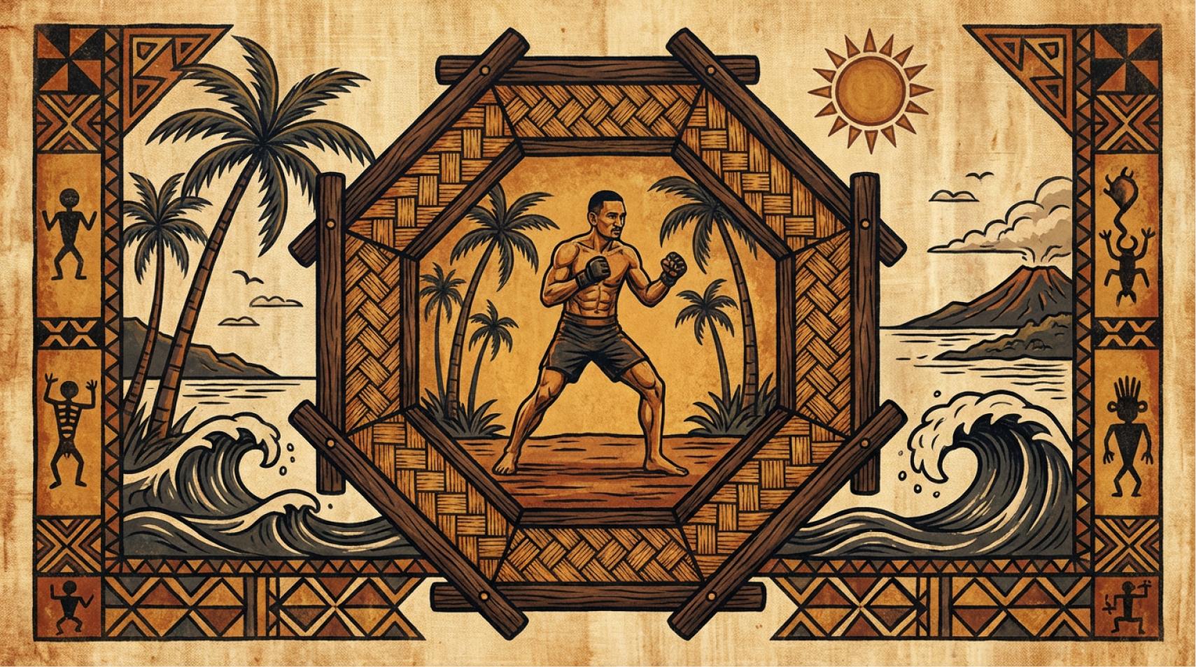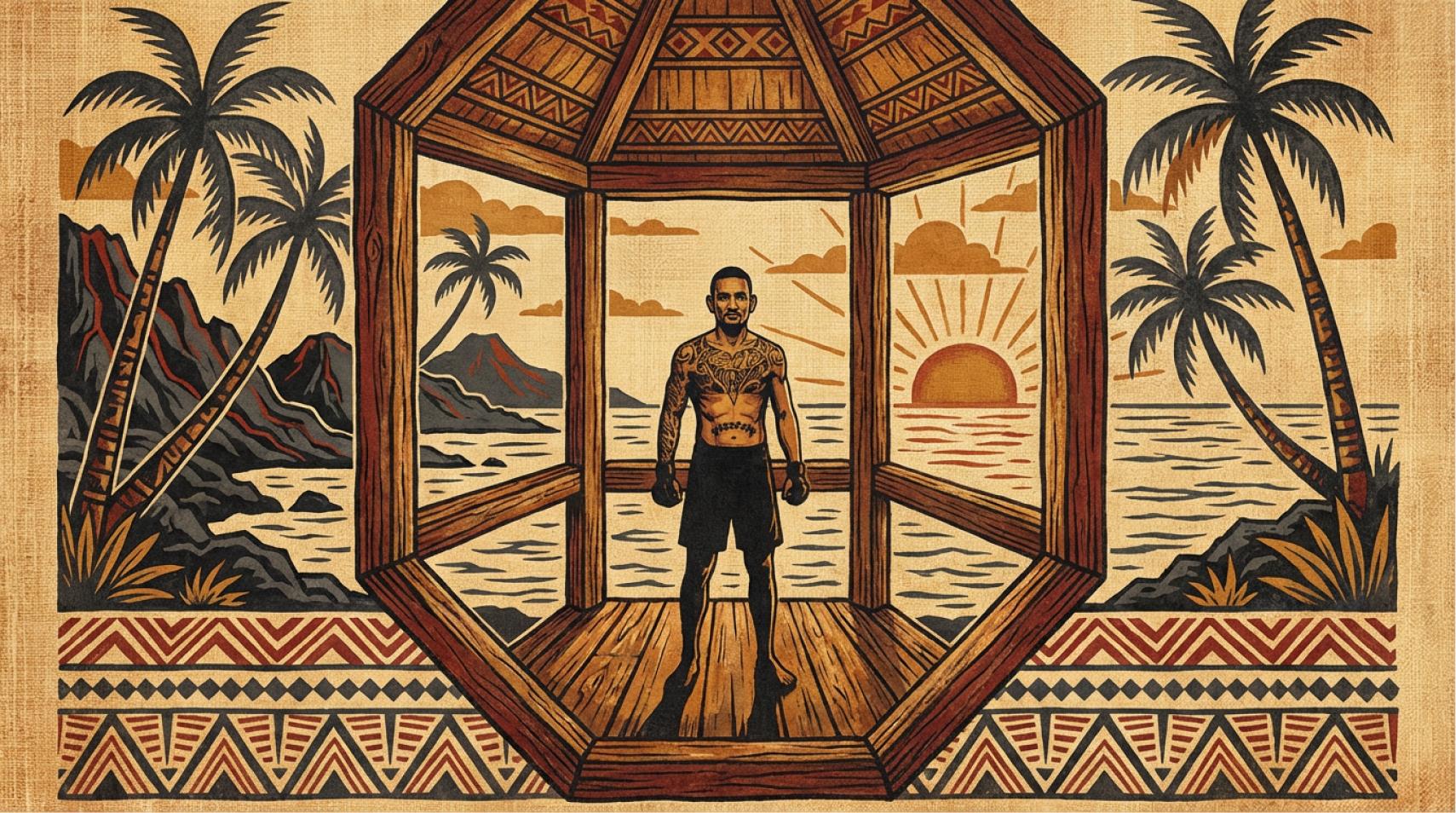 Rooted in Polynesian woodblock print tradition — tapa patterns, volcanic coastline, and ocean waves. The octagon becomes a sacred frame around the island warrior. Cultural identity as visual identity.