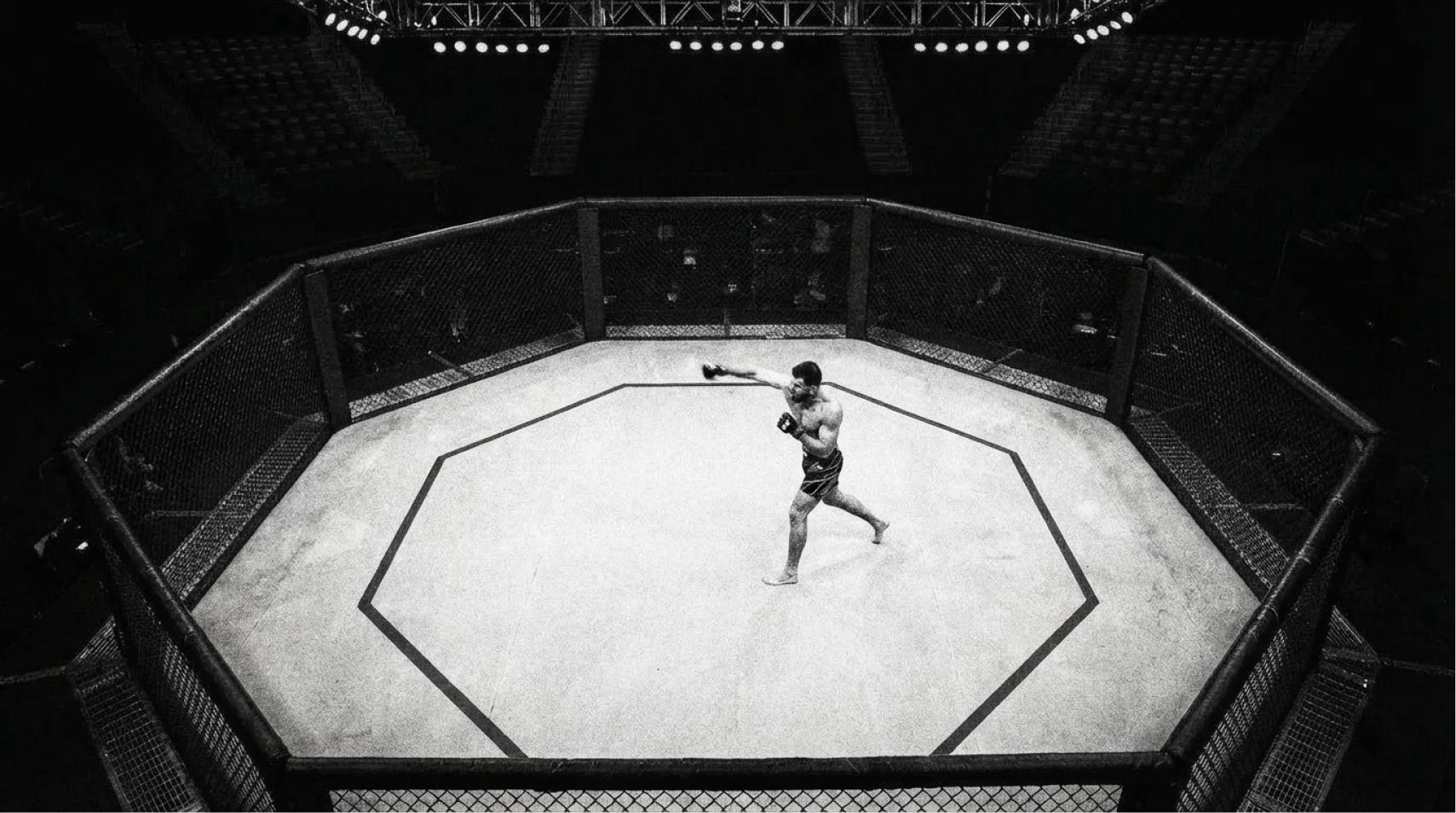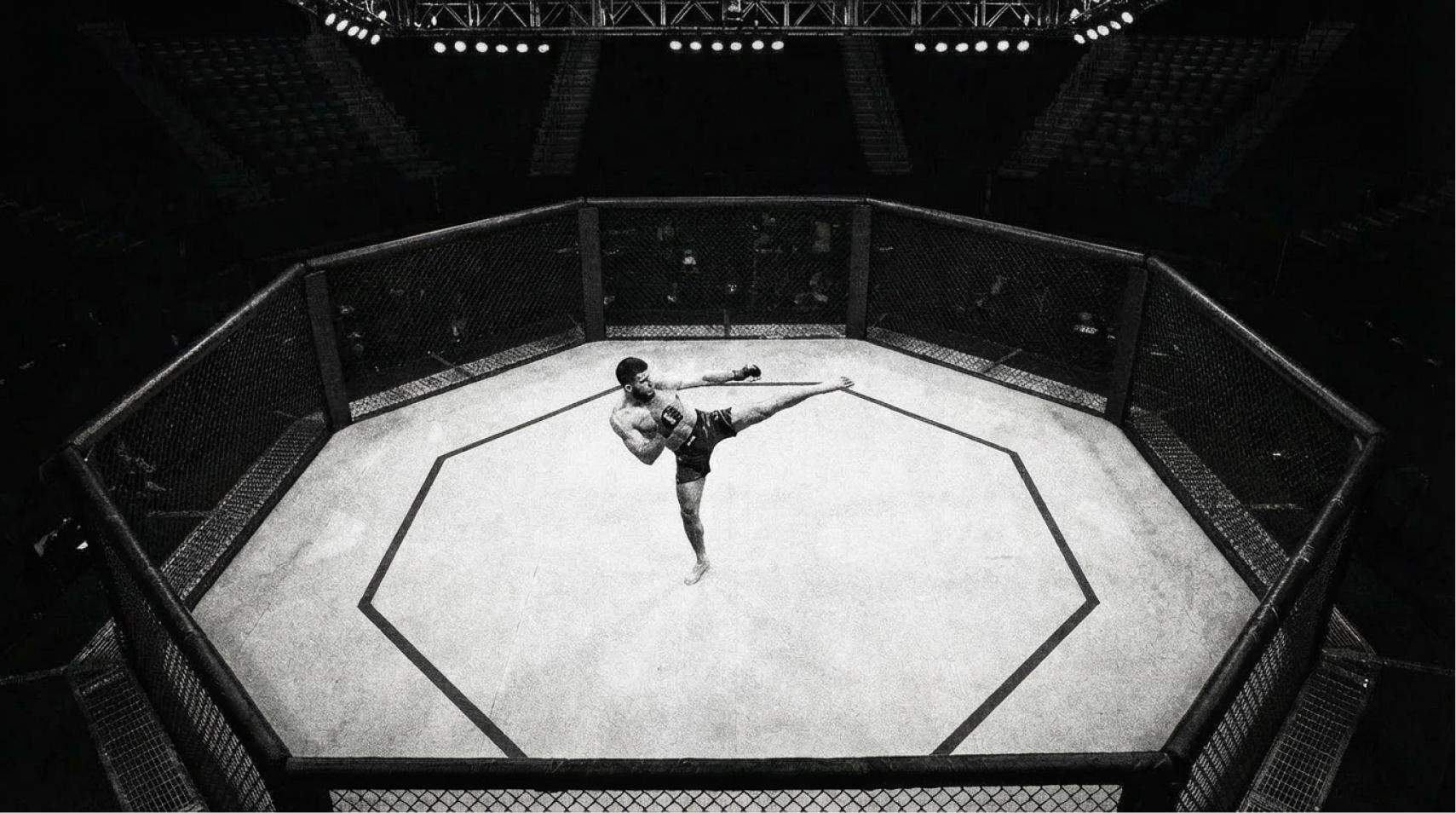 A warm golden void. The fighter isolated on a pristine UFC canvas — no clutter, no noise. Product-shoot discipline applied to an athlete. Let the subject speak entirely for itself.